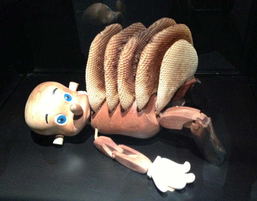 El tercer fragmento es PINE. Esta instalación denominada inicialmente Pinocchio Laboratorio de Formas, se exhibió en el 2011 en la Escuela de Artes Plásticas y Visuales de la Universidad Nacional, como parte de la tesis de grado de Leonardo Ramos. Esta instalación está compuesta por un panel o tablero luminoso, dibujos y un sarcófago de madera, así como varias vitrinas y un video donde vemos al artista en la noche halando un automóvil que ha atado previamente a su cuerpo como si se tratara de un animal de carga, mientras un individuo en un momento dado del video toca la trompeta. En el tablero luminoso podemos ver un esquema que da cuenta de una transformación del personaje que nace de un pino y luego se transforma en niño según la historia de Carlo Collodi, Pinocchio (1880). A Ramos le interesa esta figura por los procesos de transformación que debe atravesar, los cuales lo relacionan con personajes como el perro de Acteón, Melampo, y a su vez con el héroe del mismo nombre a quien se le quemaron los pies. El artista plantea una serie de relaciones donde el pino, la piña (fruto del pino) y la glándula pineal conforman un eje central que acentúa lo mismo, un aventura y confrontación con la muerte. Las abejas aquí (al igual que en el texto de Collodi) cumplen una importante función reparadora y de transformación radical: Pinocchio se transforma en niño cuando encuentra las abejas trabajadoras, nos recuerda Ramos en sus textos.